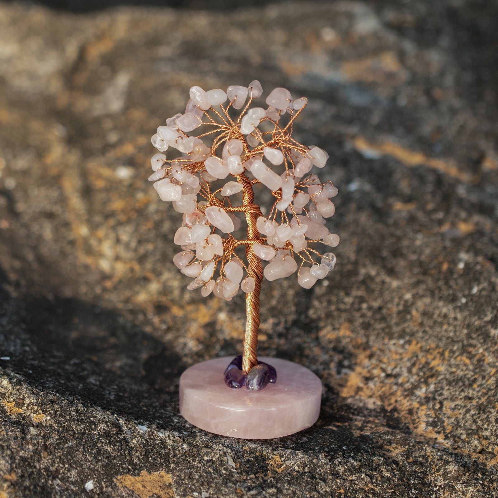 Set upon a rose quartz base and intertwined with golden copper wire, this crystal tree acts as an energetic anchor, attracting harmony in relationships and prosperity in life. The copper trunk channels and amplifies the energy of the stones, allowing love and abundance to flow effortlessly through your space. Whether placed in your home, office, or sacred corner, it serves as a radiant reminder that love is the foundation of all prosperity.